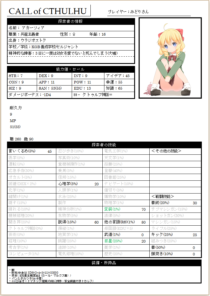 それにしても何というか……体力・体格共にミニマムだった為にそれに合いそうなイラストを引っ張ってきたら見事にかぁいいイラストがヒットしたのでそれで行くことにしました。